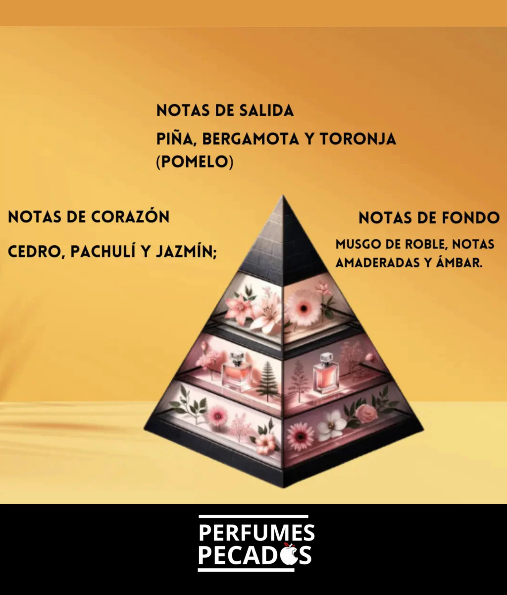 Desde el primer instante, seduce con sus notas de salida frescas y vibrantes de bergamota, piña y toronja, que aportan un carácter enérgico y refrescante. En el corazón, se despliega una mezcla elegante de pachulí, cedro y jazmín, que añade profundidad y sofisticación al aroma. Finalmente, su base cálida y envolvente combina musgo de roble, notas amaderadas y ámbar, dejando una estela persistente y masculina.